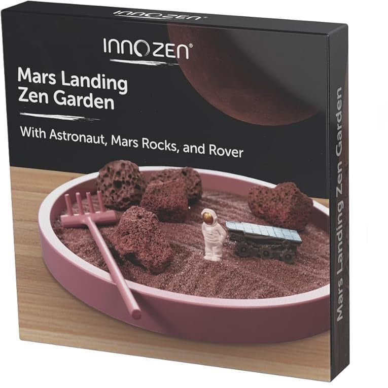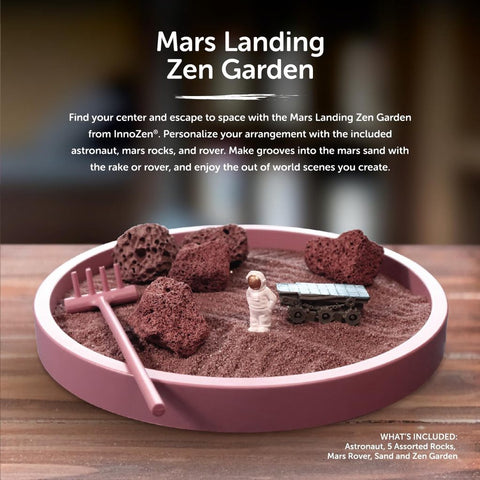A unique relaxation tool for the Mars enthusiast in your life! Use the rake to make peaceful lines in the dark red sand and your astronaut will stand among the rocks and admire your handiwork. Comes complete with a round tray, rocks, sand, a rake, a Mars rover, and an astronaut. It calms like a Japanese zen garden, while giving permission to “play Mars” like a kid. Before you know it, you'll be lost in another world, tending to your Martian landscape and making new scenes for your astronaut buddy.