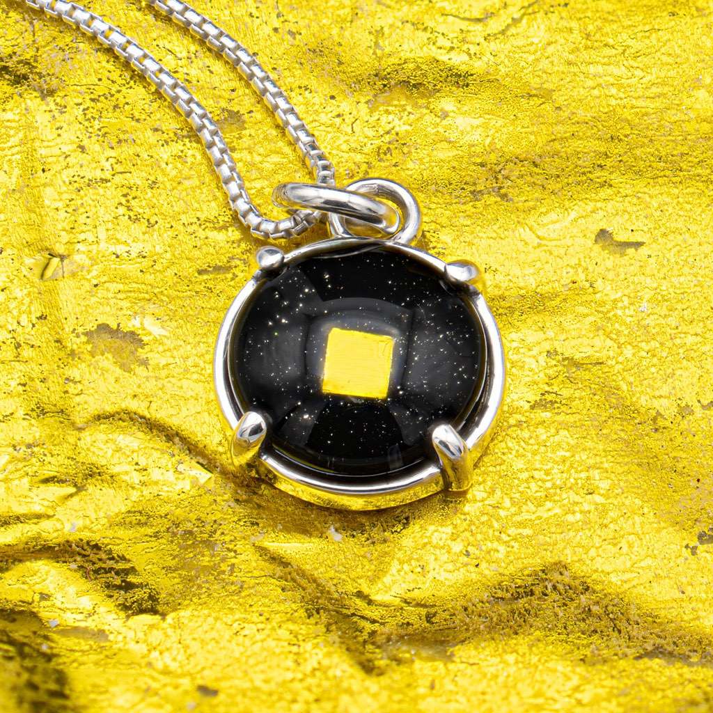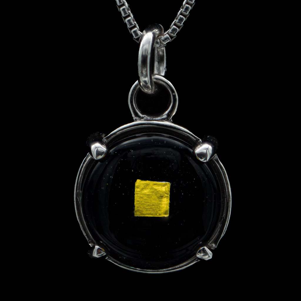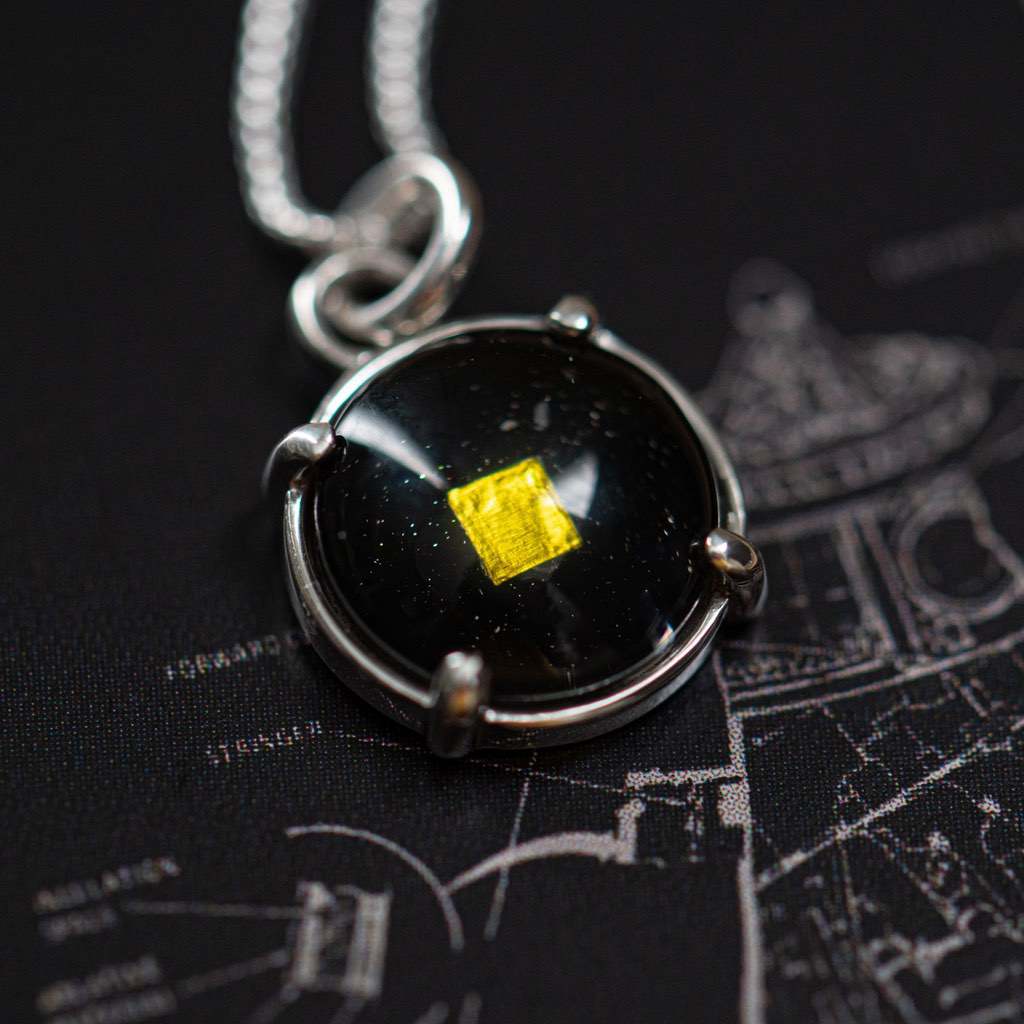 The foil is set against black resin, with small amounts of mica powder to create an out-of-this-world backdrop. The entire piece is strung on an 18-inch sterling silver chain and comes packaged in a hinged black jewelry box. An informational authenticity card is also included behind the box's interior padding.