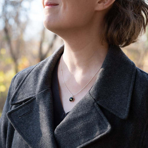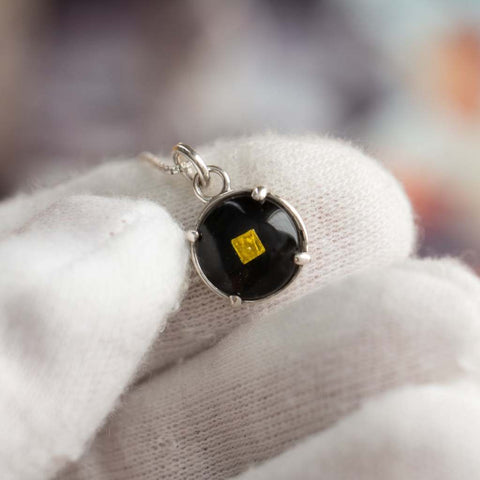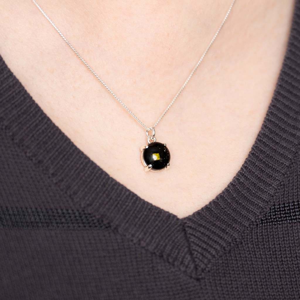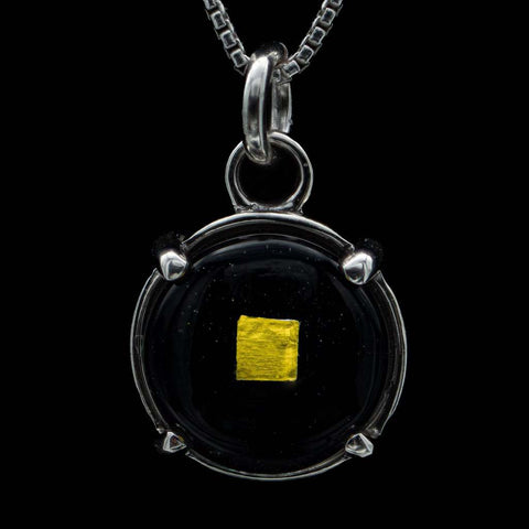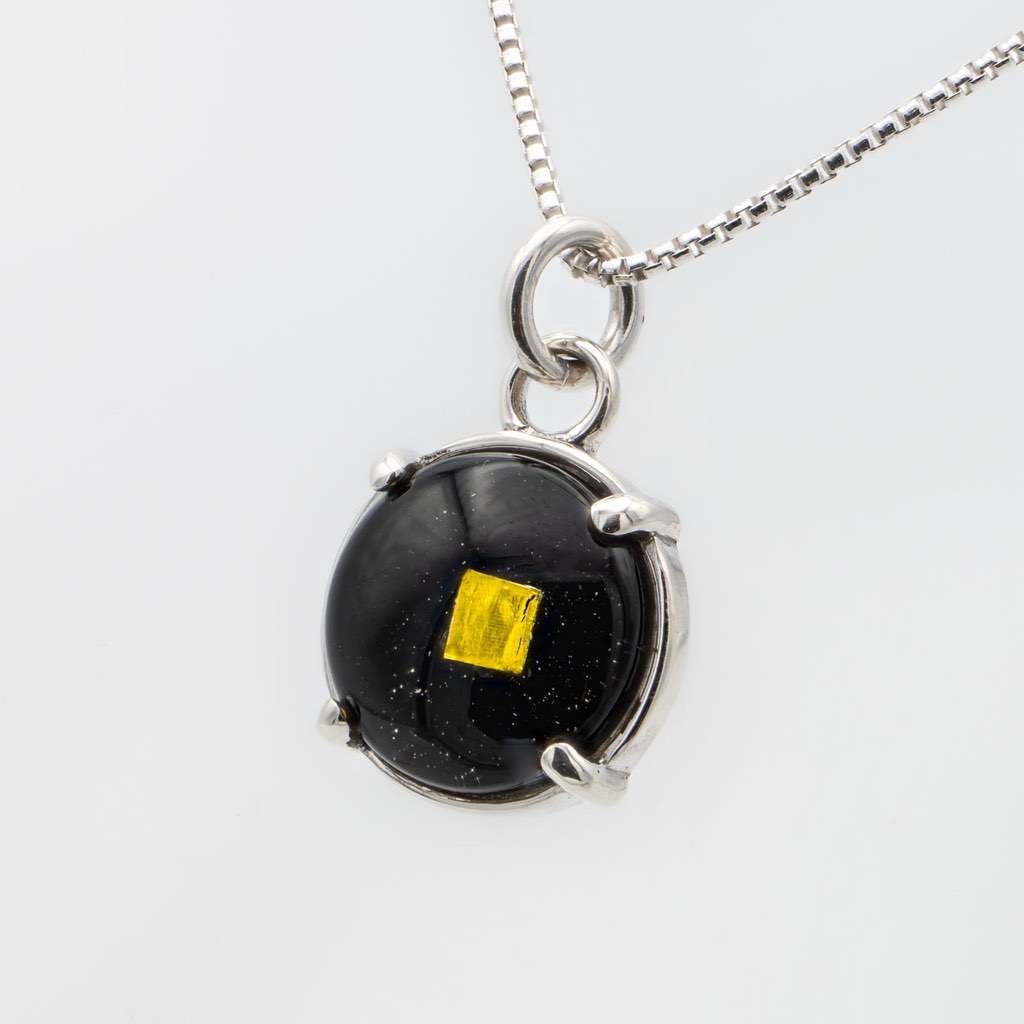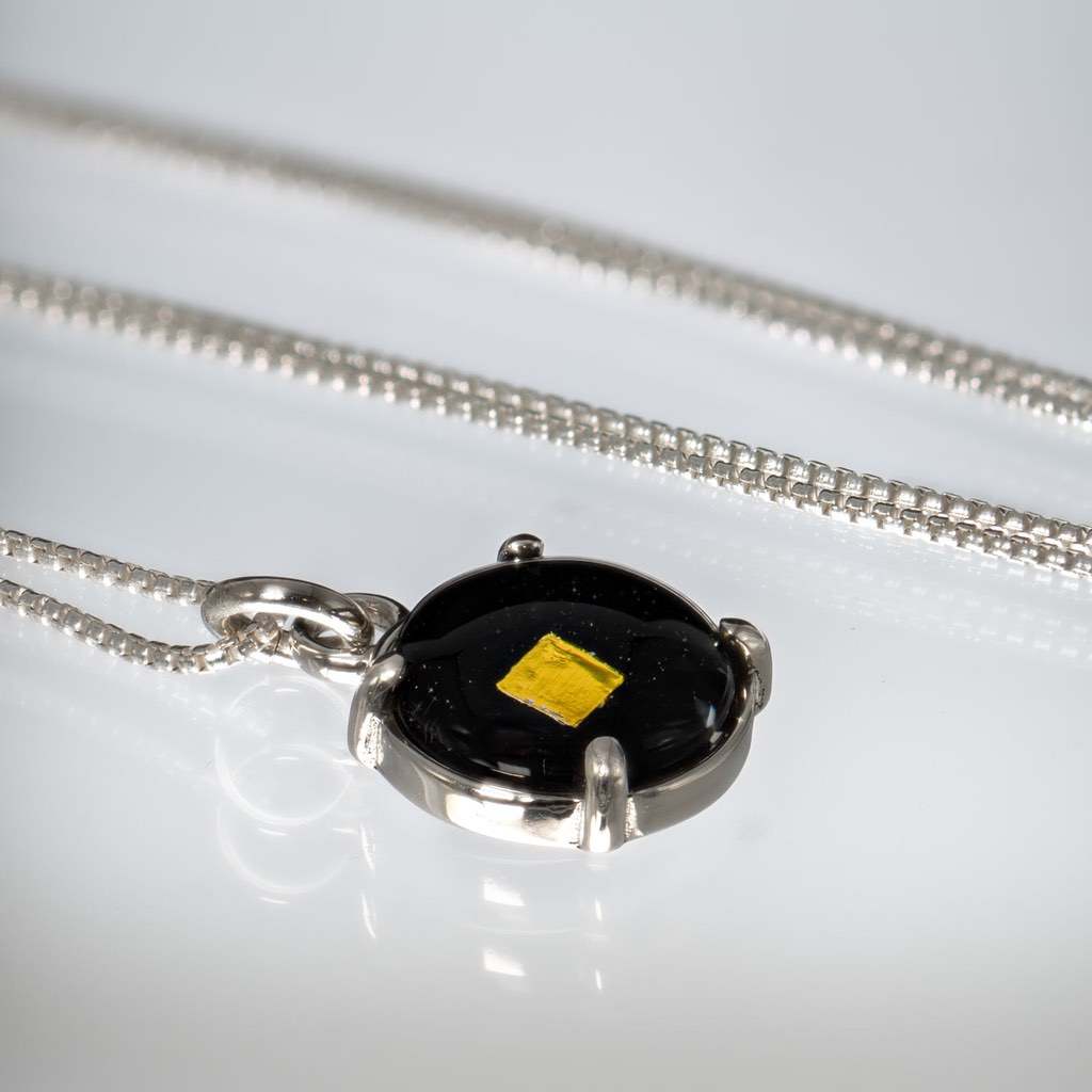 The foil is set against black resin, with small amounts of mica powder to create an out-of-this-world backdrop. The entire piece is strung on an 18-inch sterling silver chain and comes packaged in a hinged black jewelry box. An informational authenticity card is also included behind the box's interior padding.